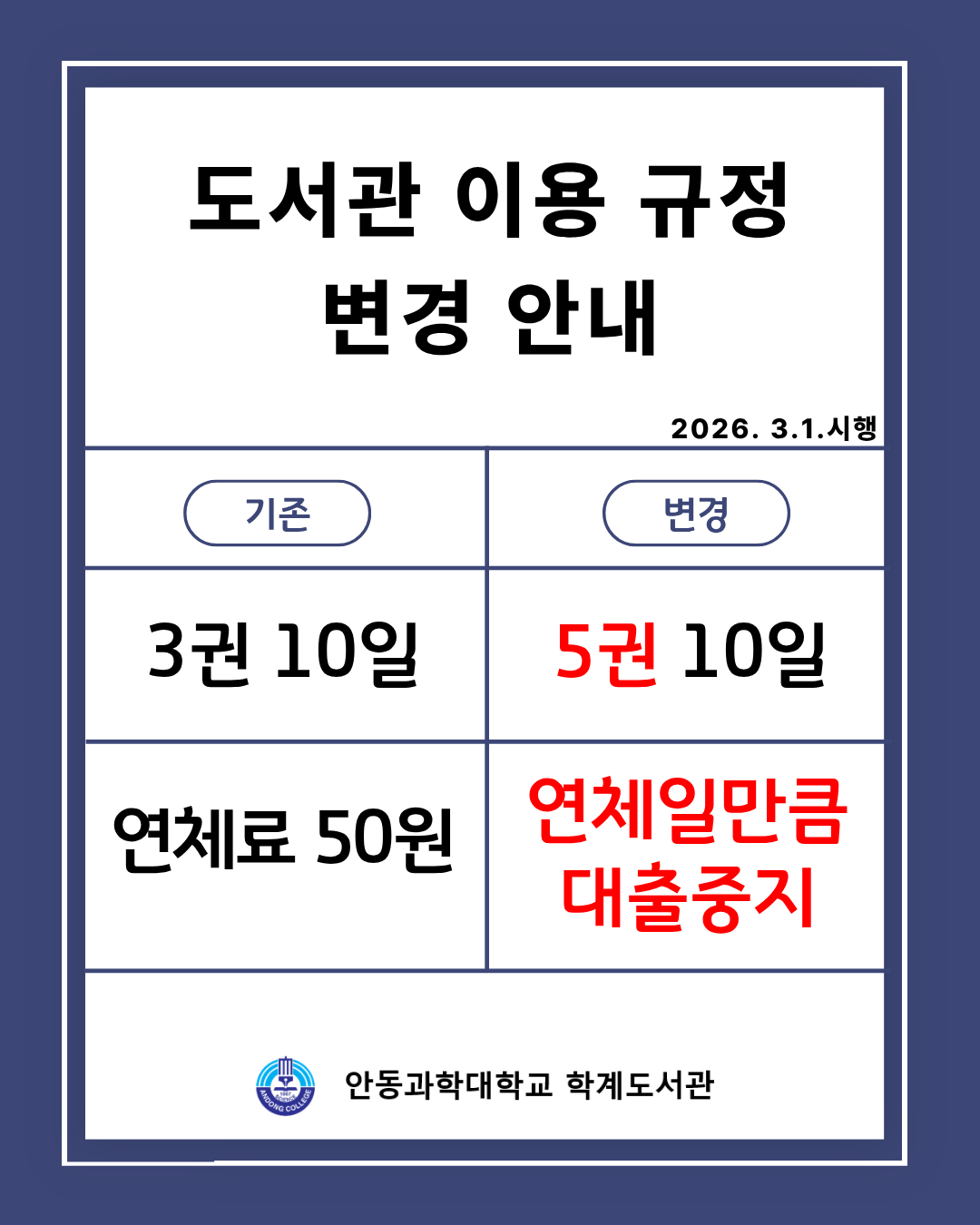 | ▶ 939 | 도서관 이용 규정 변경 안내(2026.03.01.) | 이*아 | 2026-03-03 | 217 |